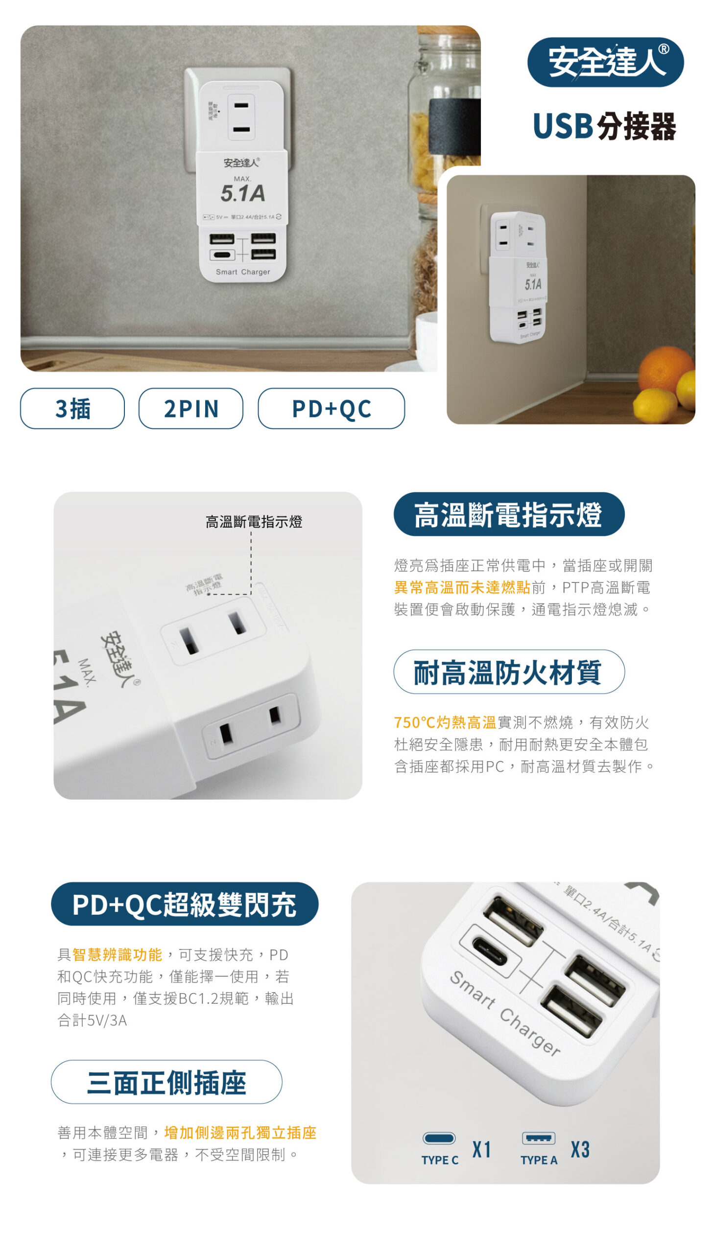 【安全達人R-20U】3插2P 5.1A USB分接器(壁插)