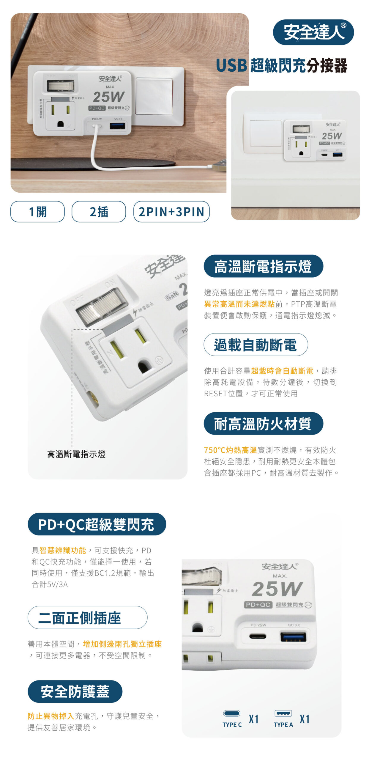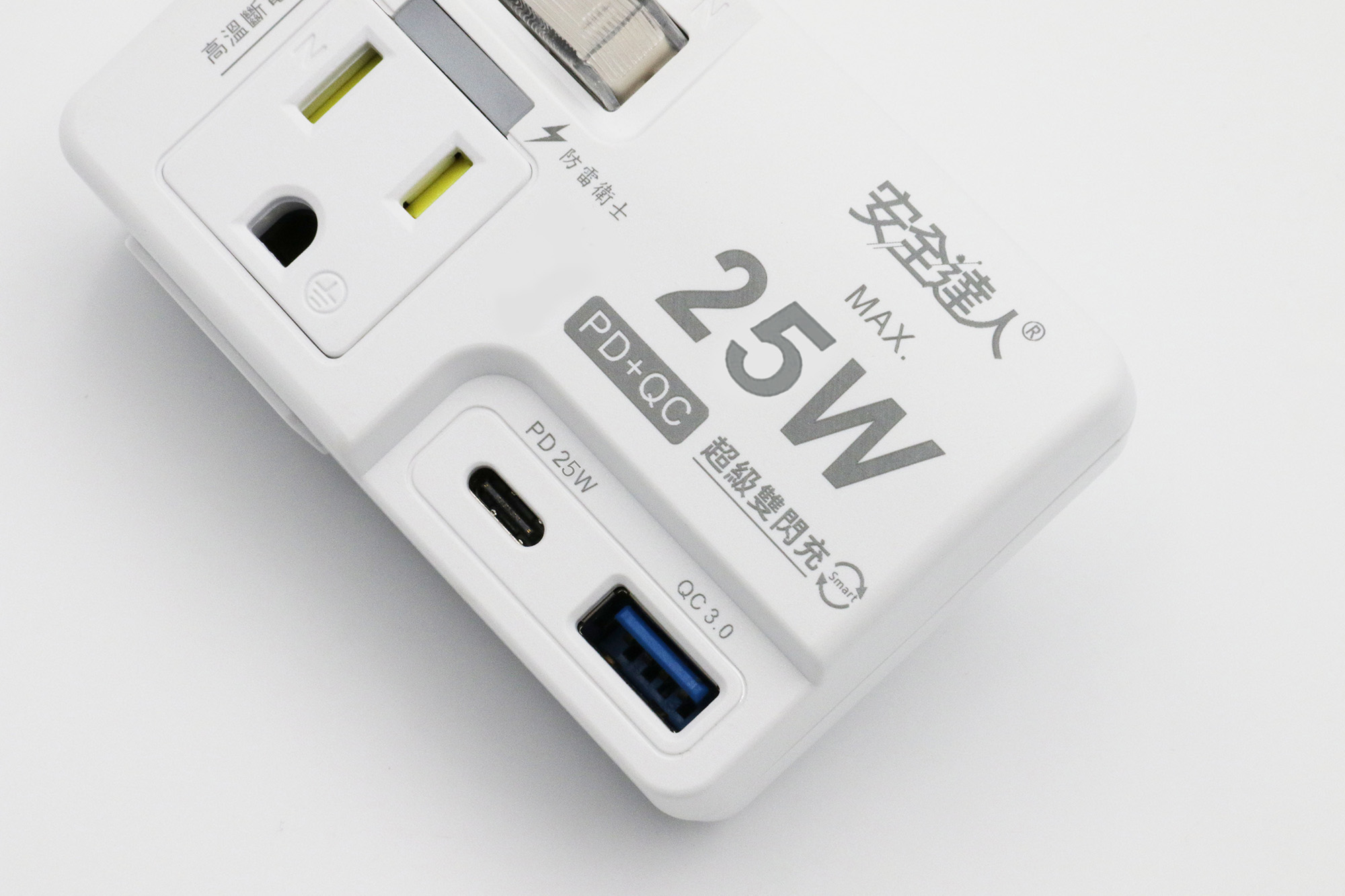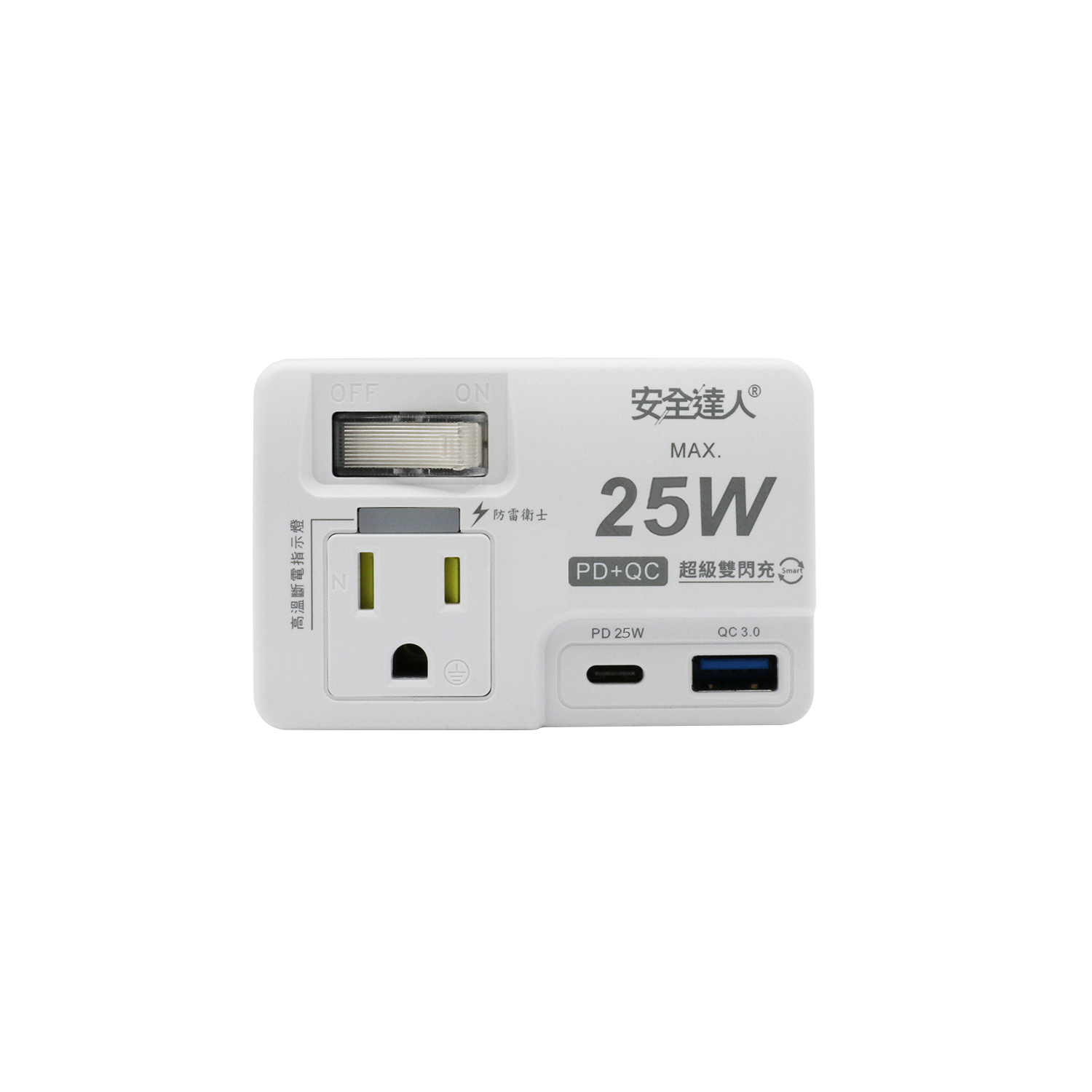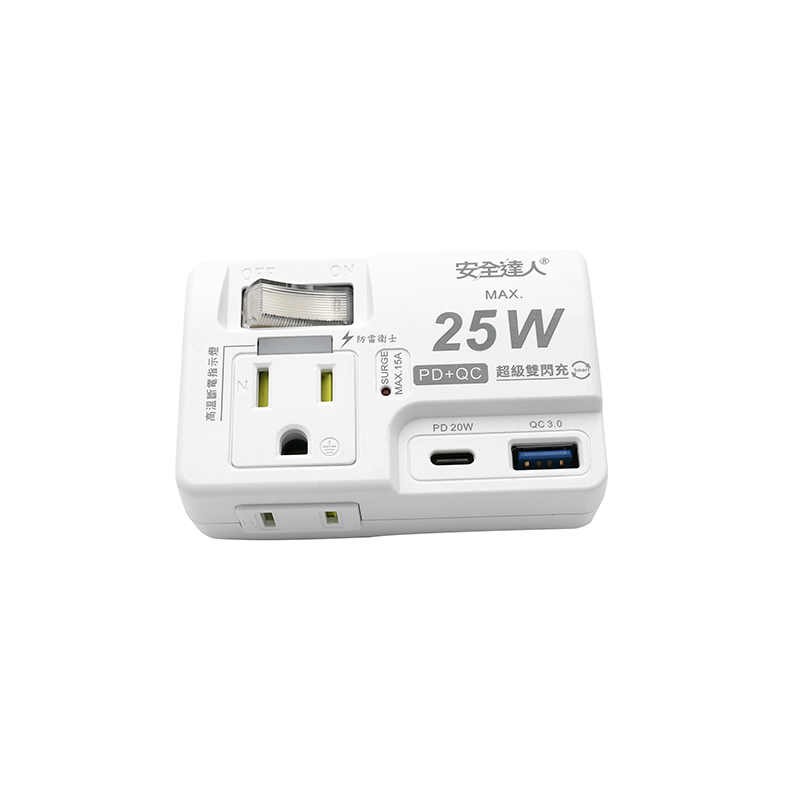 【安全達人R-61P25NC】1開2插2P+3P 25W USB超級閃充分接器