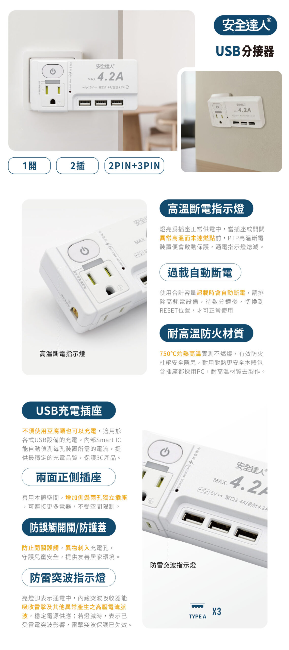 【安全達人R-82LC】1開2插2+3P 分接器(壁插)