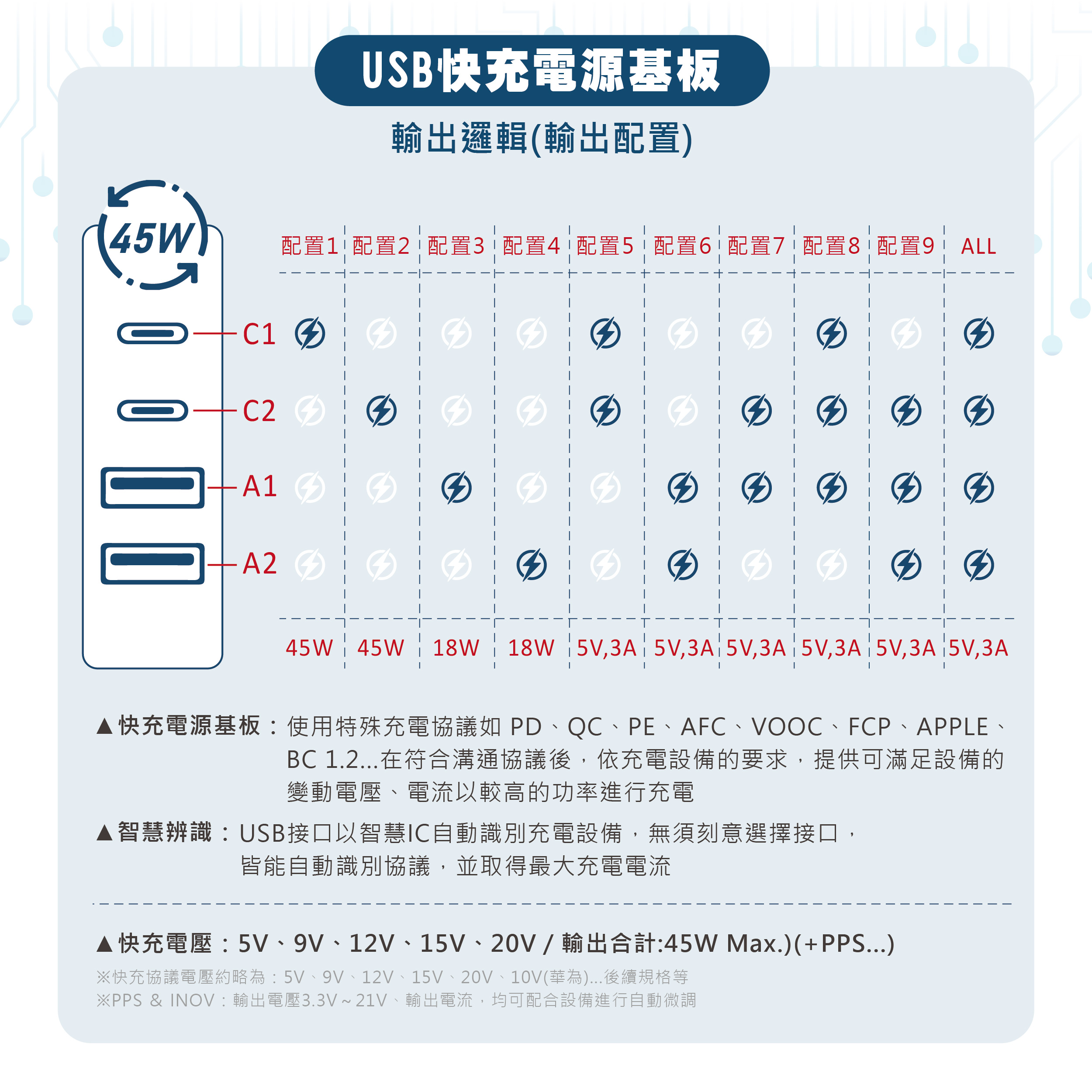 ◆內置Smart charger晶片,具智慧辨識功能,單孔最大輸出電流為45W